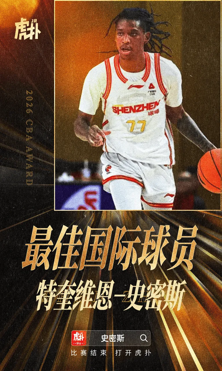 虎扑04月26日讯 CBA官方宣布,深圳男篮球员特奎维恩-史密斯当选本赛季最佳国际球员。